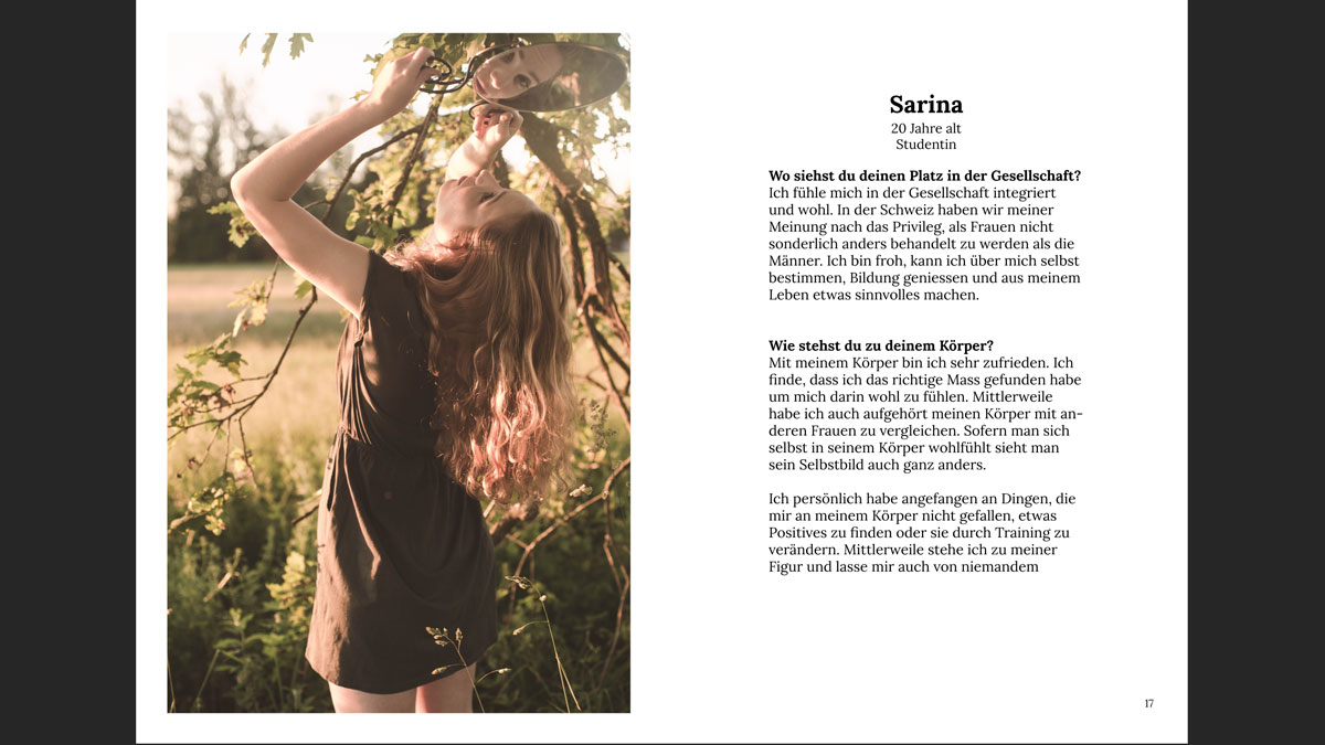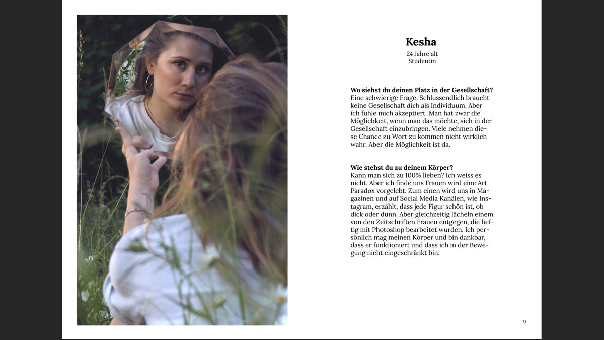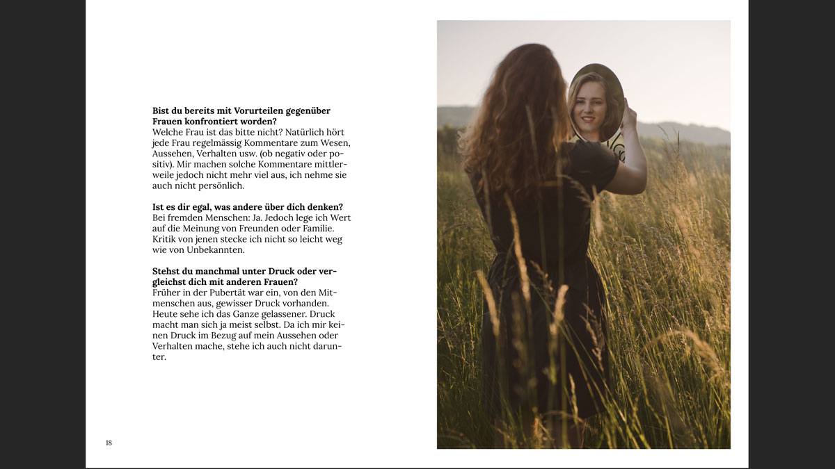 Parallel dazu haben wir die Frauen zu ihrem Körpergefühl, Vorurteilen in der Gesellschaft und ihrer Wahrnehmung von Idealen befragt. Die Antworten sind im Layout eingebettet und geben so die Möglichkeit, die Frau und ihre Sichtweise in Verbindung mit dem Foto zu sehen und kennen zu lernen. Durch die persönlichen Ansichten werden dem Betrachter neue Perspektiven zur Interpretation und Wahrnehmung der Fotos ermöglicht.