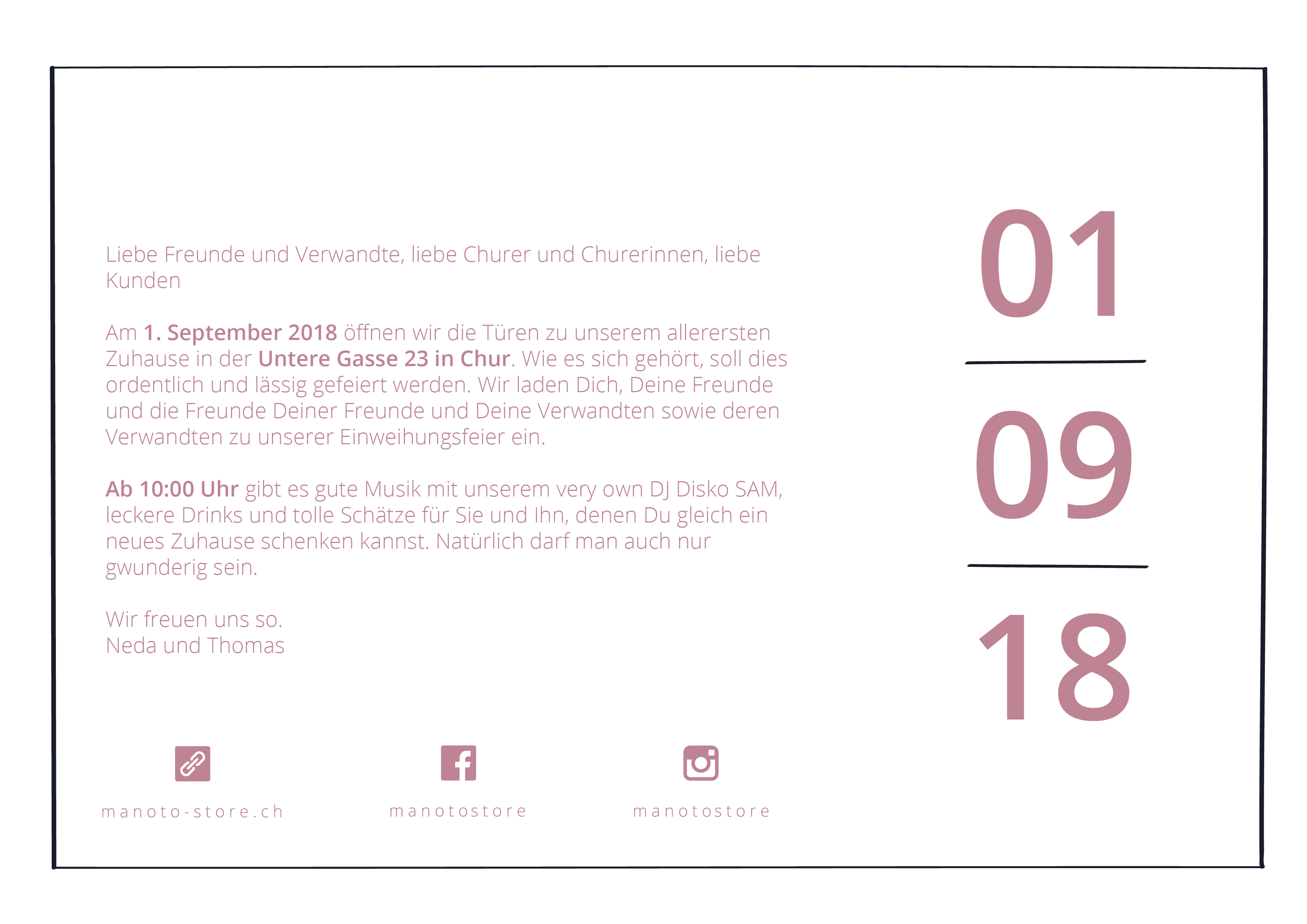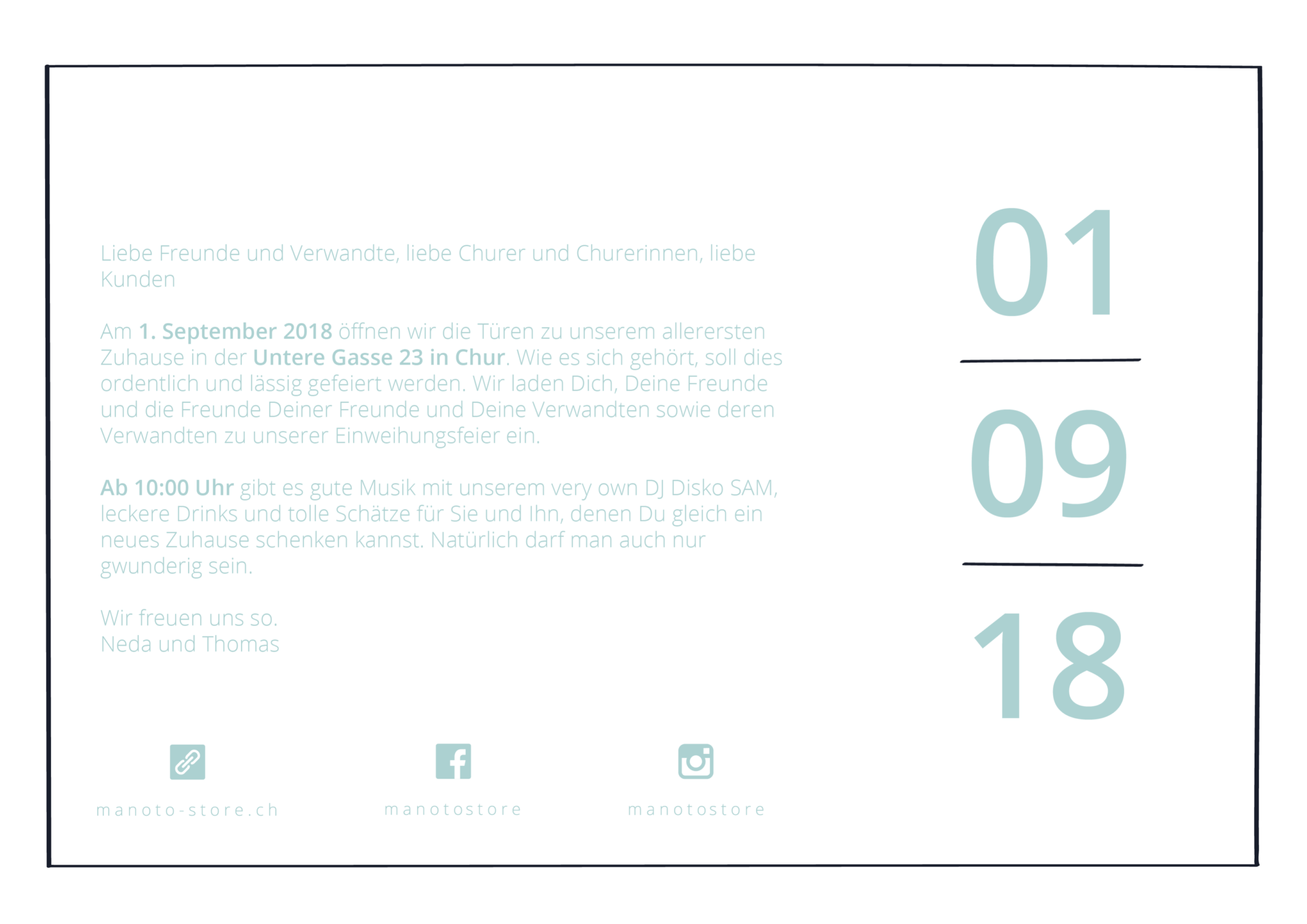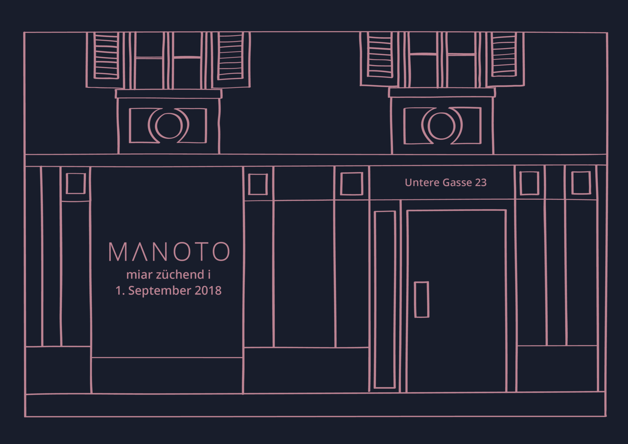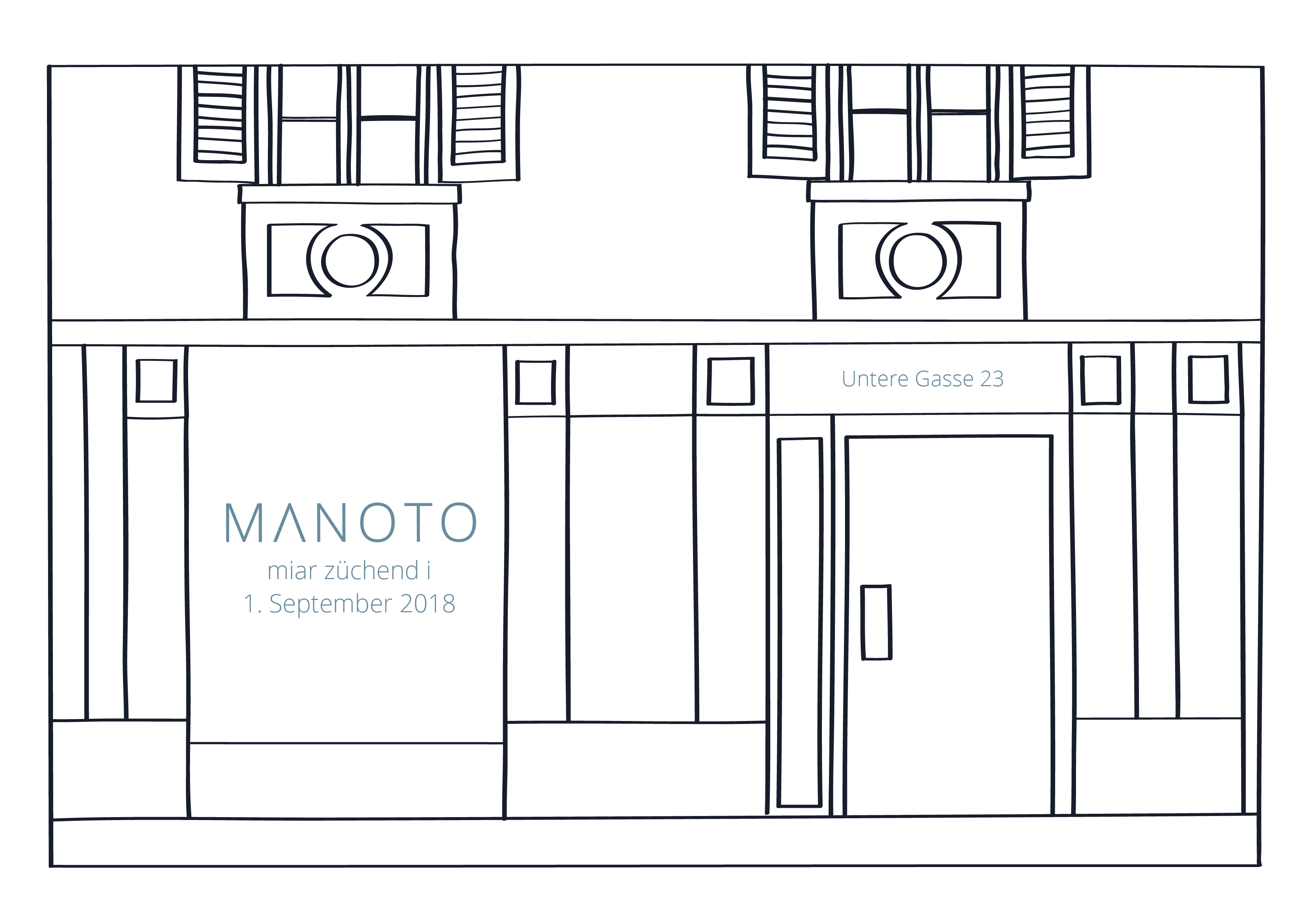 «Manoto» ist persisch und bedeutet ich und du. Genauso aber ist «Manoto» ein kleiner aber feiner Laden in der Churer Altstadt. Für die Eröffnungsfeier im September 2018, durfte ich die Einladungskarte illustrieren. Dabei setzte ich die Frontansicht des Ladelokals mit dem Ipad Pro und ProCreate zeichnerisch um. Die Farben wurden vom Auftraggeber festgelegt und entsprechen dem vorgegebenen CD von «Manoto».